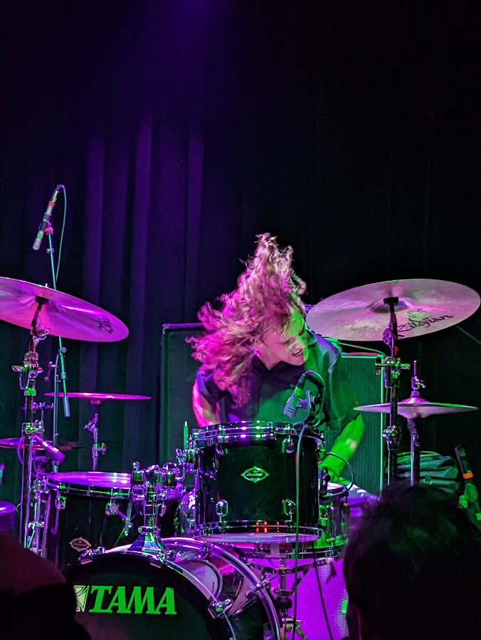 Drummer Myles is tall and powerful, beating the everlasting SHIT out of his tiny drum kit. He gets so excited about what he’s doing that sometimes he stands up during a song, I’m guessing to get more power out of his sticks.